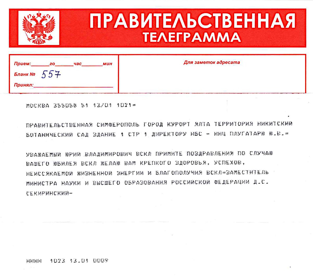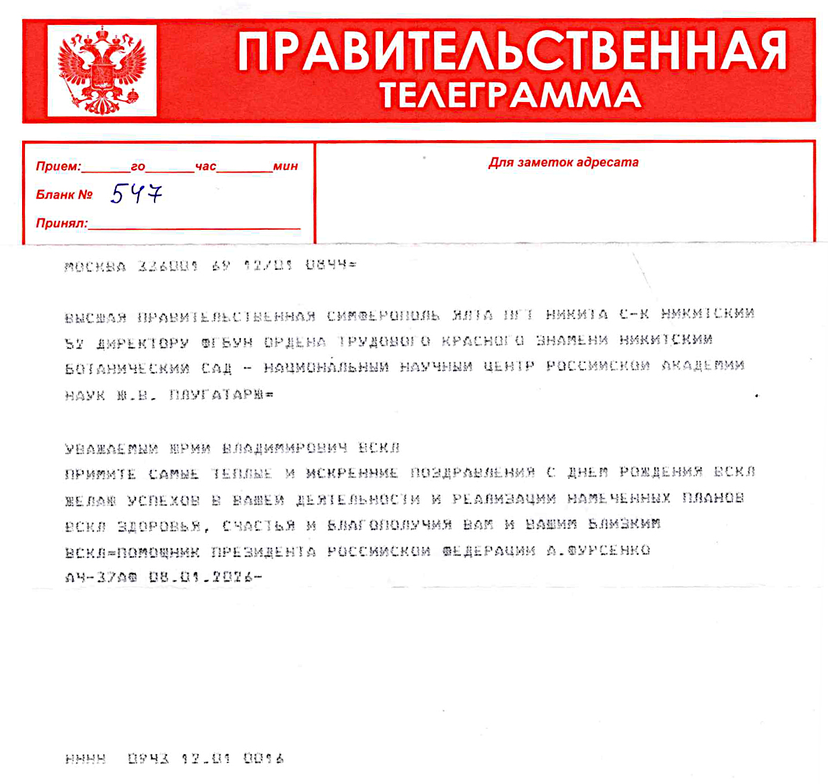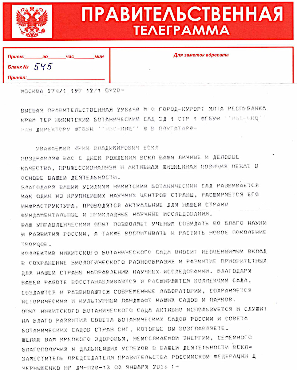ВЫСШАЯ ПРАВИТЕЛЬСТВЕННАЯ ТЕЛЕГРАММА ОТ ПОМОЩНИКА ПРЕЗИДЕНТА РОССИЙСКОЙ ФЕДЕРАЦИИ