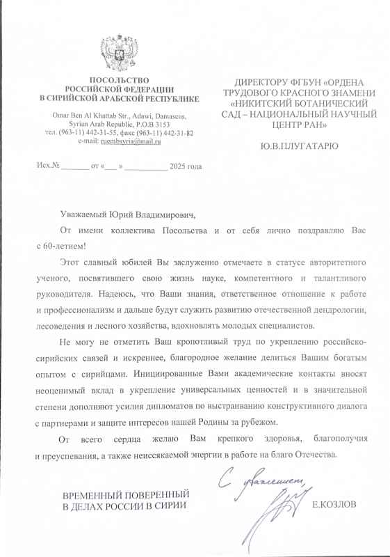 ПОЗДРАВЛЕНИЕ ОТ ПОСОЛЬСТВА РОССИЙСКОЙ ФЕДЕРАЦИИ В СИРИЙСКОЙ АРАБСКОЙ РЕСПУБЛИКЕ