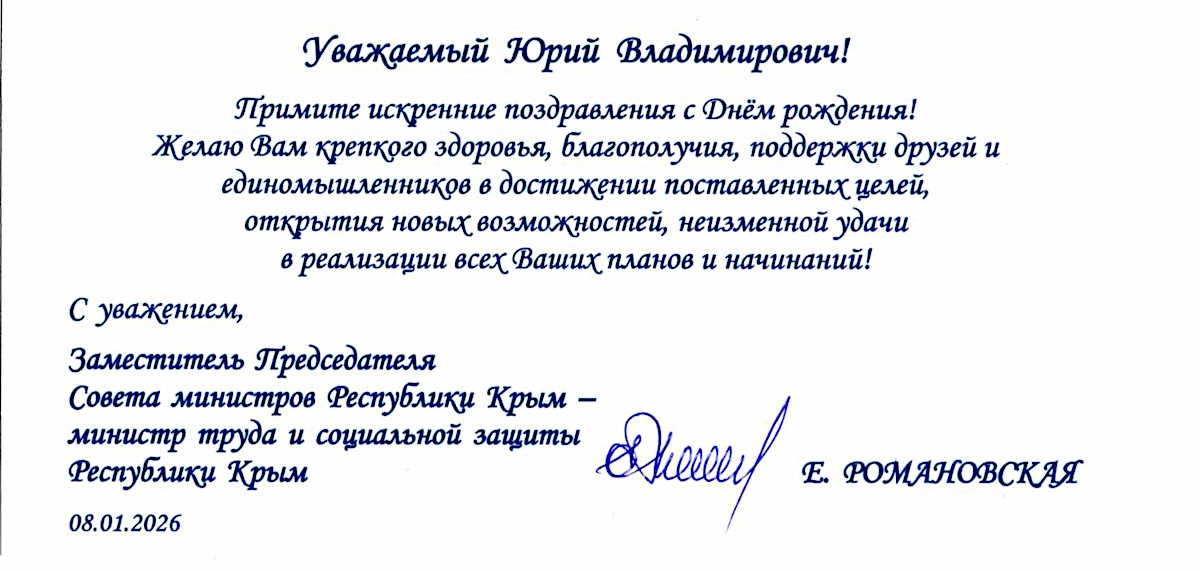 ПОЗДРАВЛЕНИЕ ОТ ЗАМЕСТИТЕЛЯ ПРЕДСЕДАТЕЛЯ СОВЕТА МИНИСТРОВ РЕСПУБЛИКИ КРЫМ - МИНИСТРА ТРУДА И СОЦИАЛЬНОЙ ЗАЩИТЫ РЕСПУБЛИКИ КРЫМ